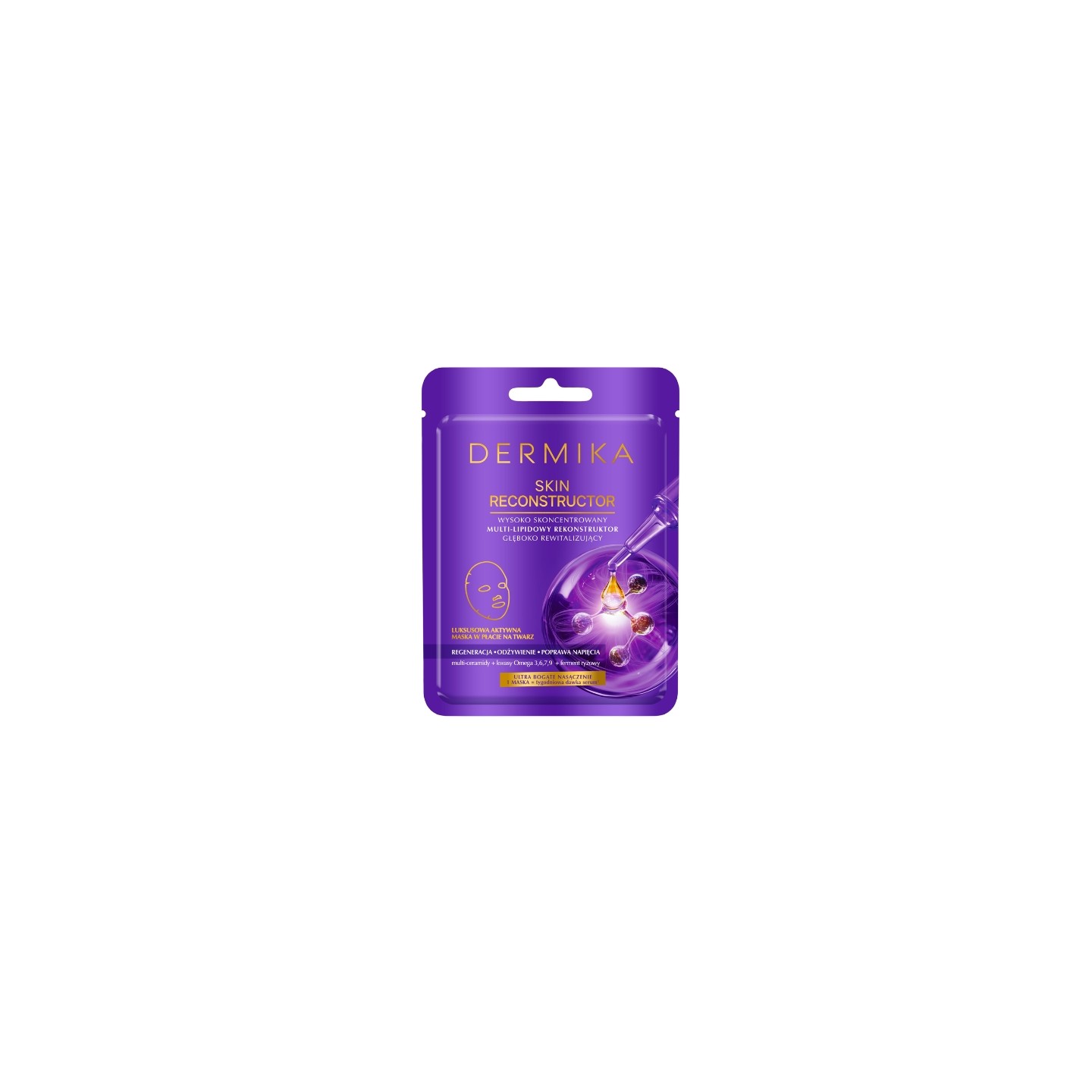 Dermika's Multi-Lipid Skin Reconstructor is a luxurious sheet mask designed for skin requiring intensive reconstruction, regeneration, and restoration of its hydrolipid balance. It acts as an advanced skincare treatment that quickly improves the condition of dry, weakened, and uncomfortable skin. Its advanced formula, based on multi-ceramides, Omega 3, 6, 7, and 9 fatty acids, and rice ferment, supports the skin's natural defenses, reduces water loss, and strengthens the epidermal structure. The mask intensely nourishes, smooths, and improves skin's elasticity, restoring a healthy, radiant appearance.