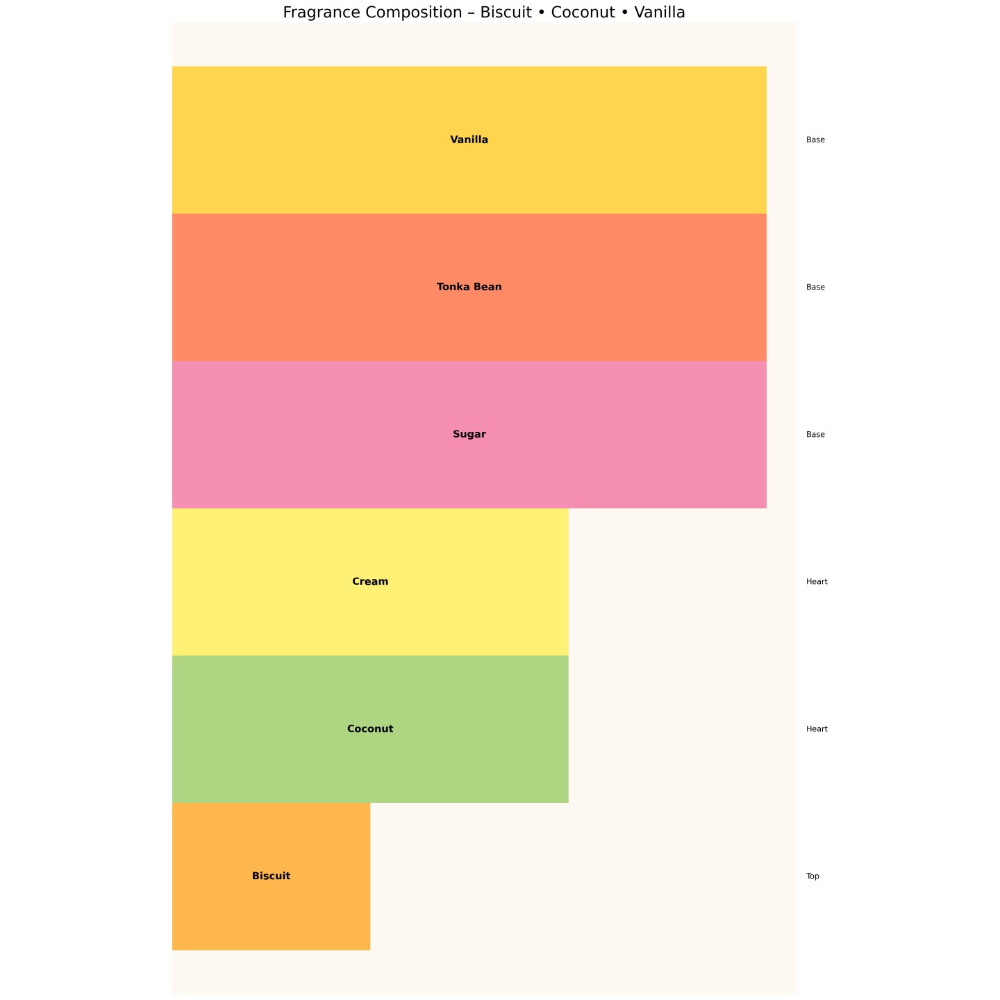 Creamy Biscuit is a fragrance that literally pampers the senses. It's a true gourmand treat – warm, sweet, and incredibly pleasant. Created for those who love scents reminiscent of their favorite desserts, full of creamy sweetness and a cozy character. The composition si with the aroma of freshly baked sponge cake – buttery, soft, and delicately sweet. This accord immediately evokes associations with the warmth and comfort of home. The heart features a velvety blend of coconut and cream, giving the fragrance a creamy depth and a dessert-like character. This stage is incredibly enveloping and addictive. The base is a true sweet delight: vanilla, sugar, and tonka bean create a warm, balsamic, and long-lasting accord that lingers on the skin like a delicate, sweet veil. Creamy Biscuit is a fragrance for those who want to smell like their favorite dessert – soft, sweet, and incredibly pleasant.