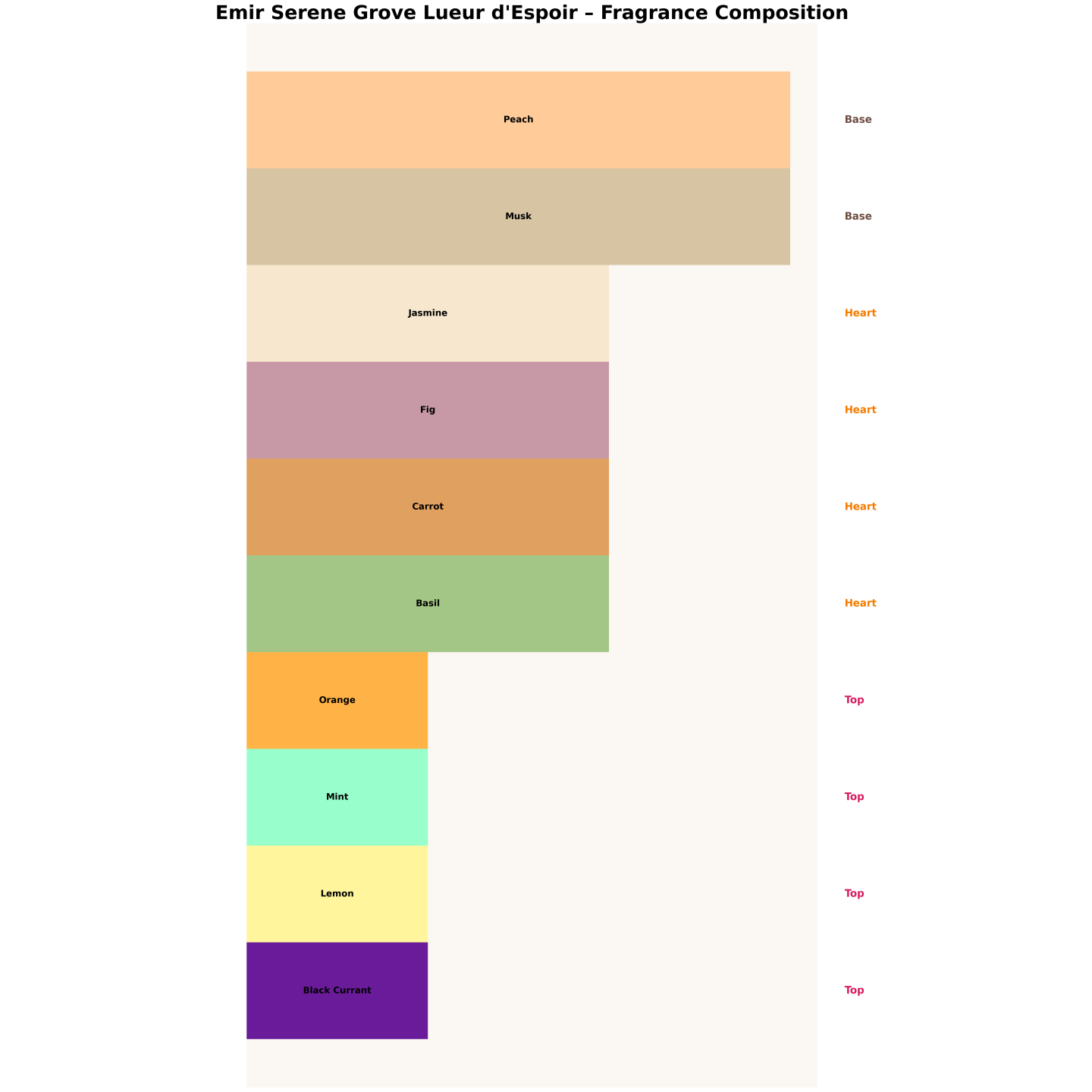 Emir Lueur d'Espoir Serene Grove is a fragrance for those who love starting their day with a dose of freshness, optimism, and aromatic balance. This composition was created for those who value contact with nature, clean air, and energizing accords of citrus and herbs. It is light, yet full of character, perfect for warmer seasons and a dynamic pace of life. The opening delights with a juicy combination of blackcurrant, lemon, orange, and cool mint—an explosion of freshness that stimulates and refreshes the mind. At the heart of the composition, vibrant notes of basil, sweet-herbal carrot, delicate jasmine, and creamy fig create an aromatic, natural accord full of soft green harmony. The base is light ale pleasantly fruity: peach adds juiciness, while musk ensures purity, longevity, and subtle sensuality. Serene Grove is a composition for lovers of original, herbal-citrus scents that boost energy and inspire action.