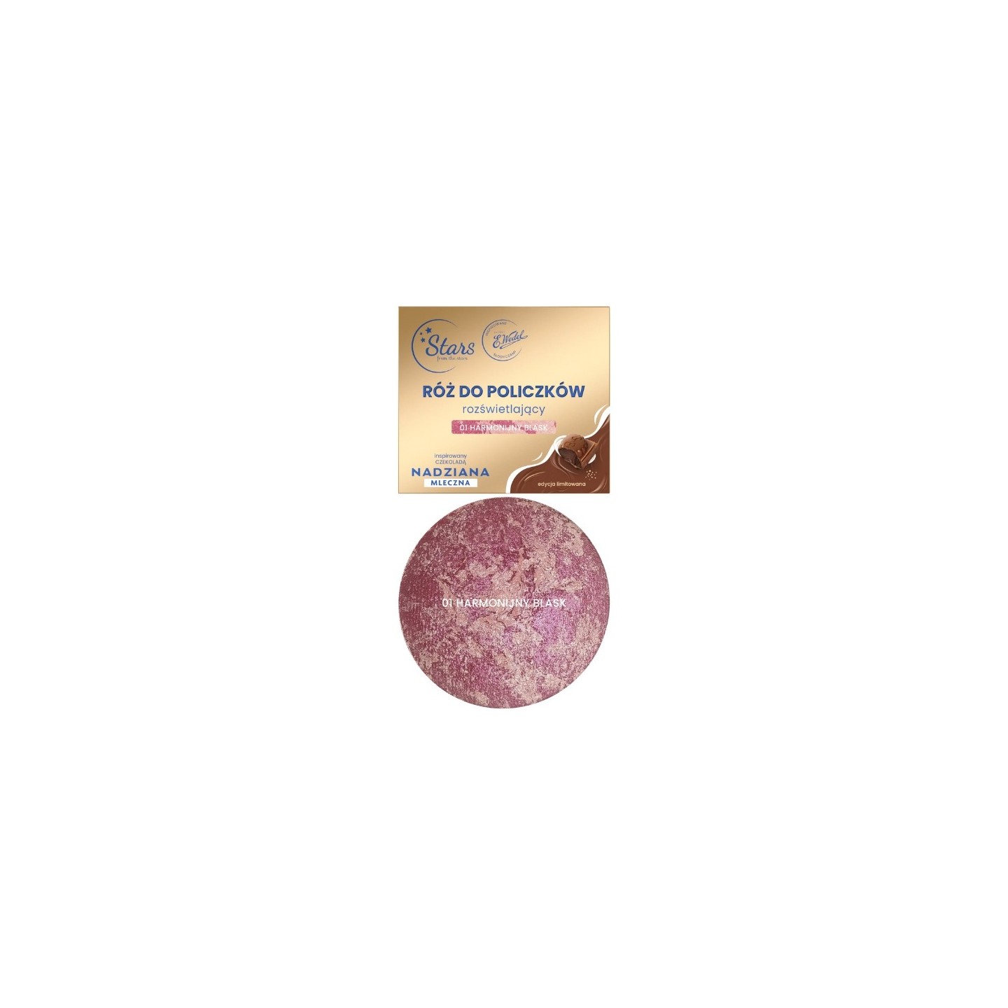 Illuminating Blush is a cosmetic that combines the beauty of makeup and extraordinary sensory experiences. Inspired by the intensely chocolate NADZIANA collection by E.Wedel, the marble blush not only gives the cheeks a healthy blush, ale also subtly illuminates them, leaving an incredible glow and the scent of Wedel chocolate on the skin. Thanks to the combination of two shades in one form, the blush allows you to perfectly match the color to your complexion or mood. Its baked formula guarantees excellent blending, beautiful finish and exceptional efficiency. The product is suitable for both subtle highlighting of the cheeks and a more expressive effect - depending on the intensity of application.