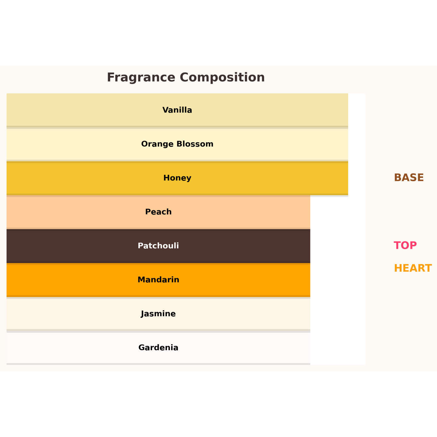 Honeymoon otwiera się soczystą mandarynką i brzoskwinią, które nadają zapachowi świeżości i radosnej lekkości. W sercu rozkwita kwiat pomarańczy, jaśmin i gardenia – klasyczne, białokwiatowe trio o eleganckim, świetlistym charakterze. Baza z miodu, paczuli i wanilii wnosi głębię, ciepło i zmysłowy, otulający finisz, który długo pozostaje na skórze. To woda perfumowana unisex dla miłośników słodko-kwiatowych kompozycji z subtelnym orientalnym tłem – idealna na wyjątkowe okazje, romantyczne wieczory i chwile, gdy chcesz pachnieć elegancko i zapadać w pamięć.