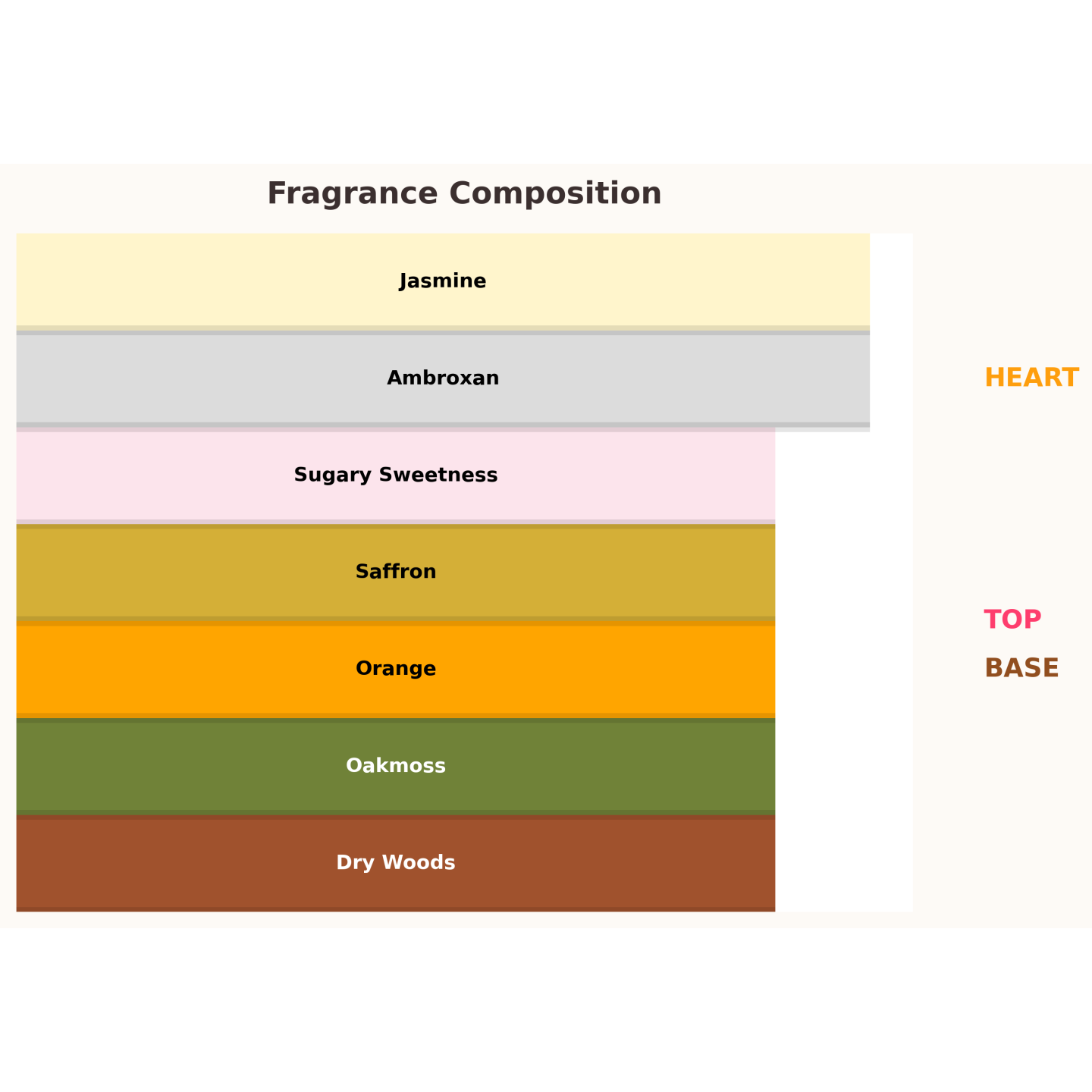Woda Perfumowana Unisex – orientalno-drzewna kompozycja o luksusowym charakterze. Otwarcie łączy szafran z soczystą pomarańczą; w sercu jaśmin z aksamitną słodyczą cukru; baza z ambroksanu, mchu dębowego i suchych nut drzewnych zapewnia głębię i długą trwałość