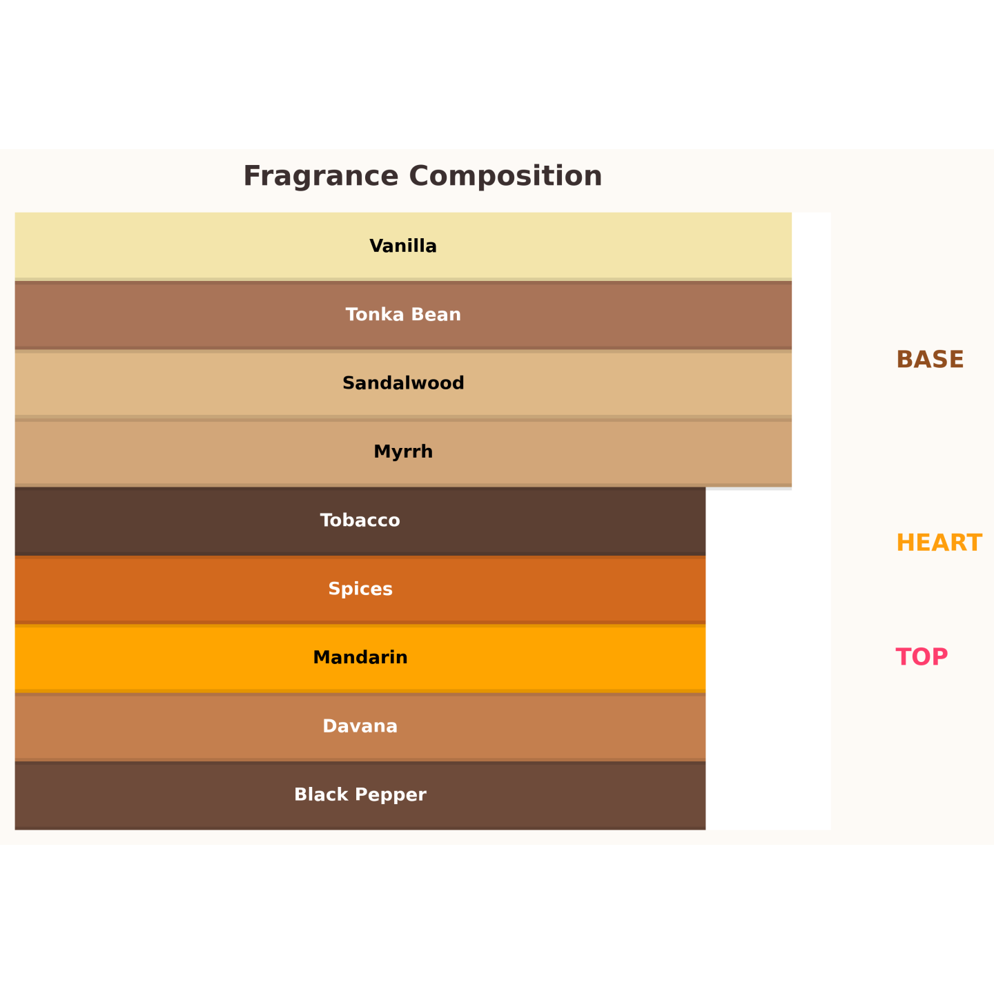 Sweet Heaven Tobacco otwiera się ciepłą, przyprawową falą, w której świetlista mandarynka spotyka zmysłową davanę i ziołowy sznyt. Po chwili kompozycja gęstnieje: dymna mirra łączy się z pikantnym czarnym pieprzem i kremowym drzewem sandałowym, tworząc szlachetne, eleganckie serce. Finisz to aksamitna mieszanina fasolki tonka, wanilii i tytoniowego akordu – przytulna, uzależniająca i długotrwała. Zapach idealny na chłodniejsze miesiące, wieczorne wyjścia i wszystkie momenty, w których chcesz podkreślić charyzmę.