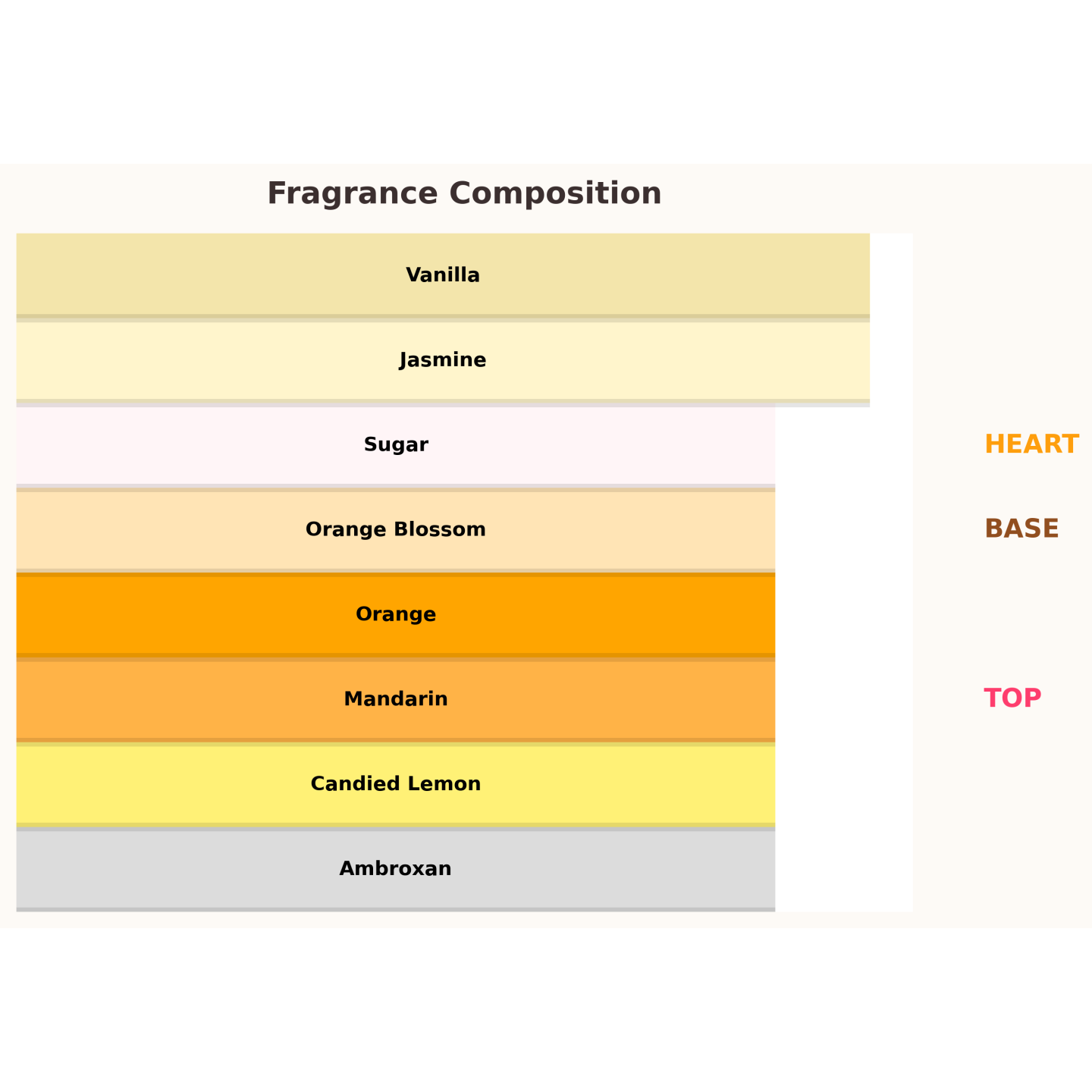 Jardin des Papillons przywołuje spacer po skąpanym w słońcu ogrodzie cytrusowym. Musująca kandyzowana cytryna, pomarańcza i soczysta mandarynka tworzą jasne, słodkie otwarcie. W sercu delikatny jaśmin i promienny kwiat pomarańczy dodają kompozycji kwiatowej elegancji i miękkości. Finał rozlewa się kremową wanilią, ciepłem cukru i zwiewnym ambroksanem, zostawiając lekki, uzależniający ślad. To zapach wolności i kobiecości – promienny, beztroski, czarujący bez wysiłku.