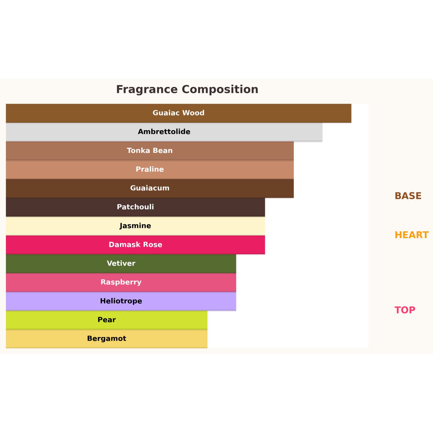 ✔ Baza: drzewo gwajakowe, ambrettolide, gwajakowiec lekarski, fasolka tonka, paczula, wetyweria, gruszka