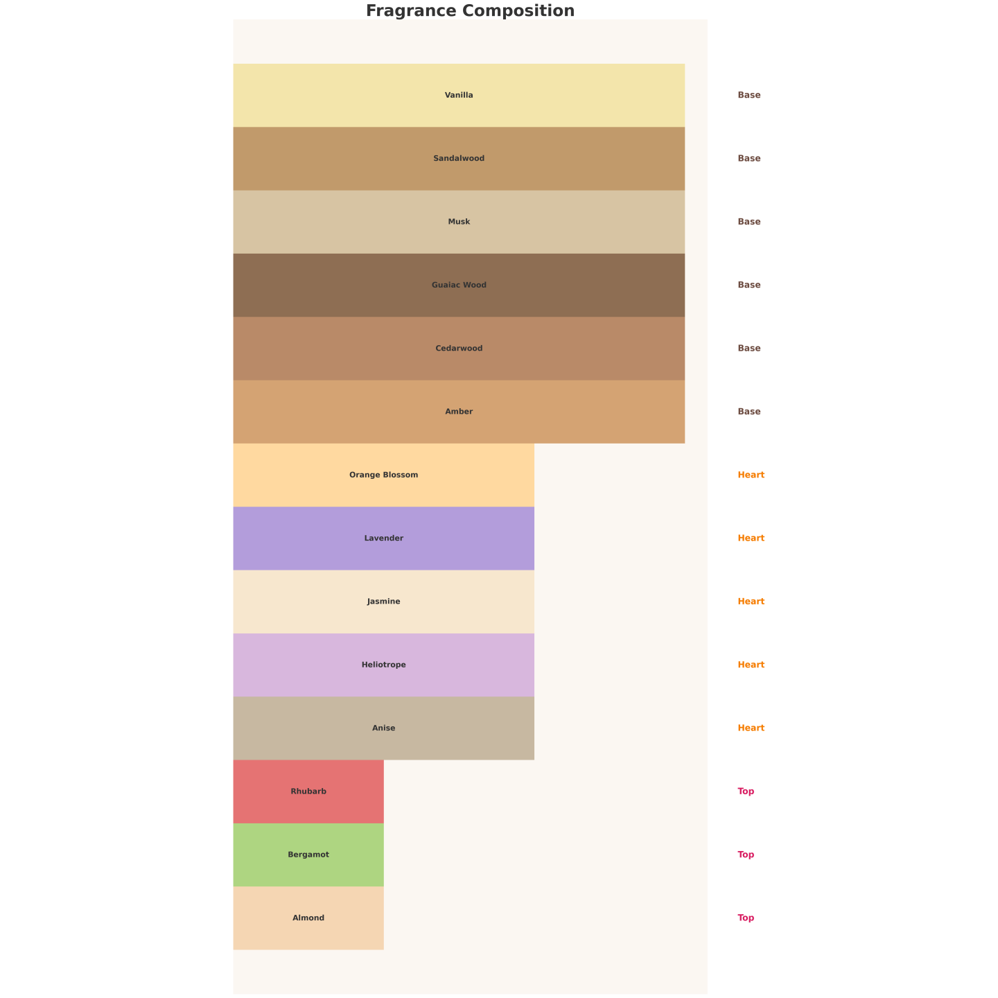 Świeżo i słodko w otwarciu (bergamotka, migdał, rabarbar), kwiatowo i aromatycznie w sercu (lawenda, jaśmin, heliotrop, anyż), a w bazie ciepło i kremowo (wanilia, drzewo sandałowe, bursztyn).