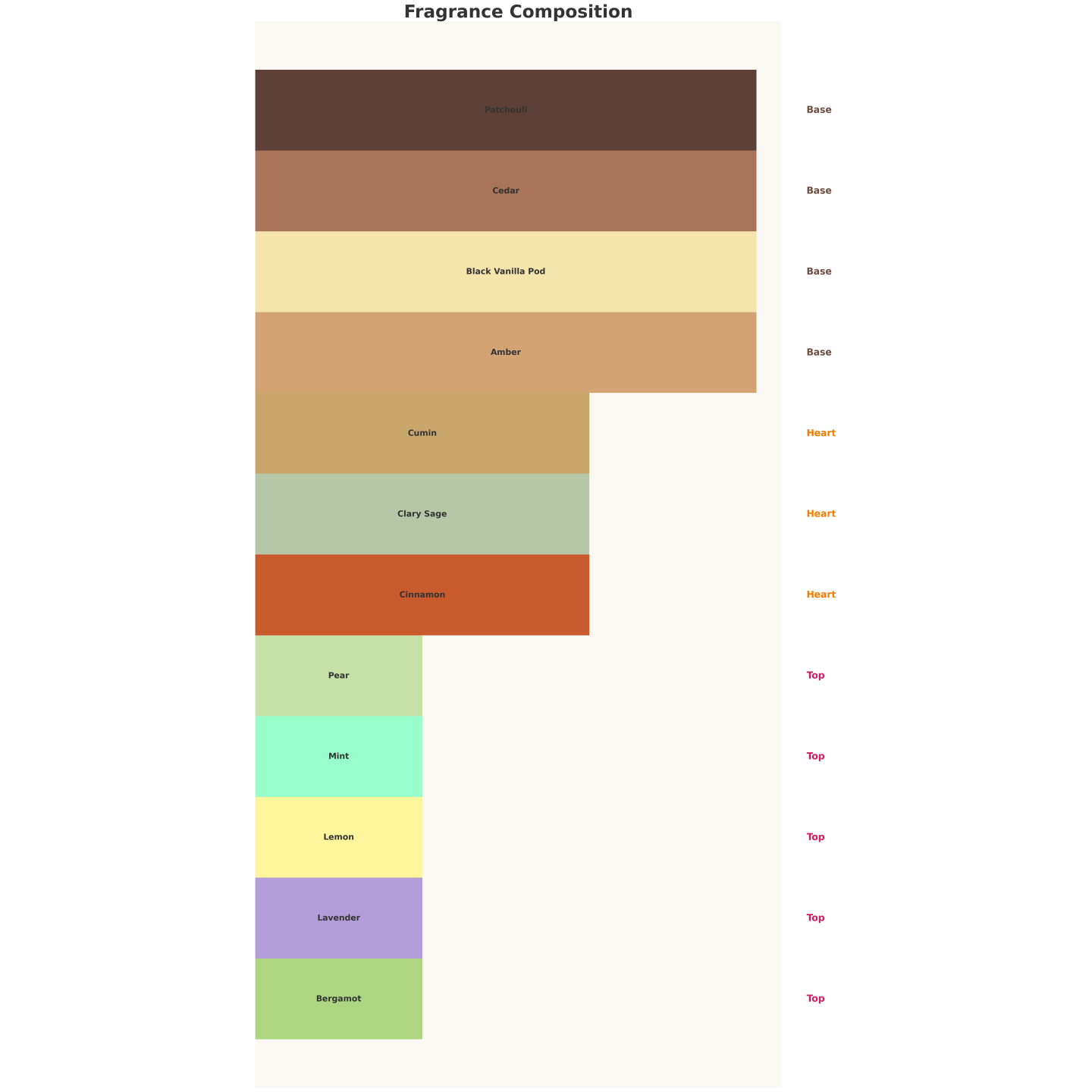To intensywna, słodko-świeża kompozycja z mocnym akcentem przypraw; gruszka i mięta w otwarciu, cynamon i szałwia w sercu, a w bazie czarna wanilia, bursztyn i paczula.