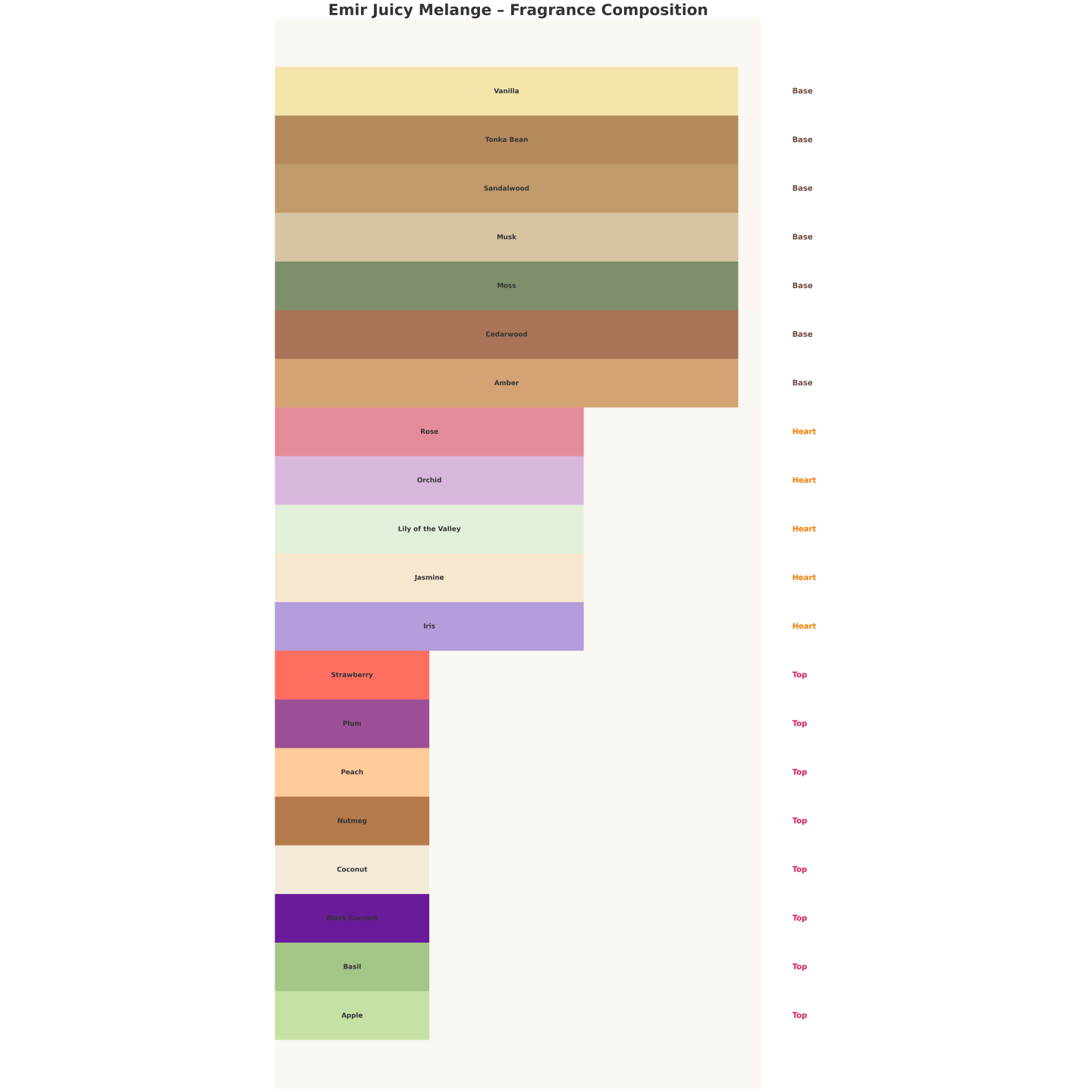 Emir Juicy Melange to zapach, który przenosi w słoneczny raj – miejsce, gdzie egzotyczne koktajle błyszczą od lodu, owoce dojrzewają w pełnym słońcu, a powietrze wypełnia radosna, beztroska energia. To kompozycja pełna życia i luksusu, idealna dla osób, które pragną pachnieć jednocześnie spontanicznie i wyrafinowanie. Otwarcie to prawdziwy spektakl owocowej słodyczy: truskawka, czarna porzeczka, śliwka, brzoskwinia, kokos, jabłko oraz korzenna gałka muszkatołowa, podkreślone zaskakującą nutą świeżej bazylii, która dodaje kompozycji nowoczesnego, zielonego twistu. Serce zapachu przynosi luksusowy, pudrowo-kwiatowy bukiet: orchidea, jaśmin, róża, konwalia oraz irys, sprawiając, że fizyczna soczystość otwarcia przechodzi w elegancką, zmysłową harmonię. Baza to gorąca, kremowa zmysłowość: wanilia, fasolka tonka, drzewo sandałowe, drzewo cedrowe, otulające piżmo, ambra oraz mech, które tworzą trwały, aksamitny, niezwykle przyjemny na skórze finał.Emir Juicy Melange jest intensywny, projektujący i komplementogenny — idealny dla osób, które kochają życie i chcą je podkreślić zapachem pełnym energii, elegancji i radosnej zmysłowości.
