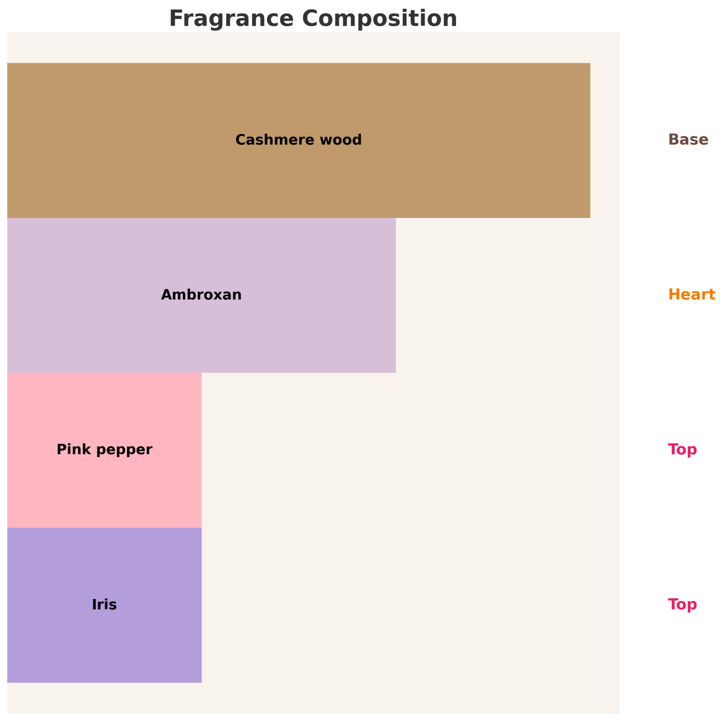 Nowocześnie, czysto i minimalistycznie: irys i różowy pieprz w otwarciu, ambroxan w sercu, drzewo kaszmirowe w bazie.