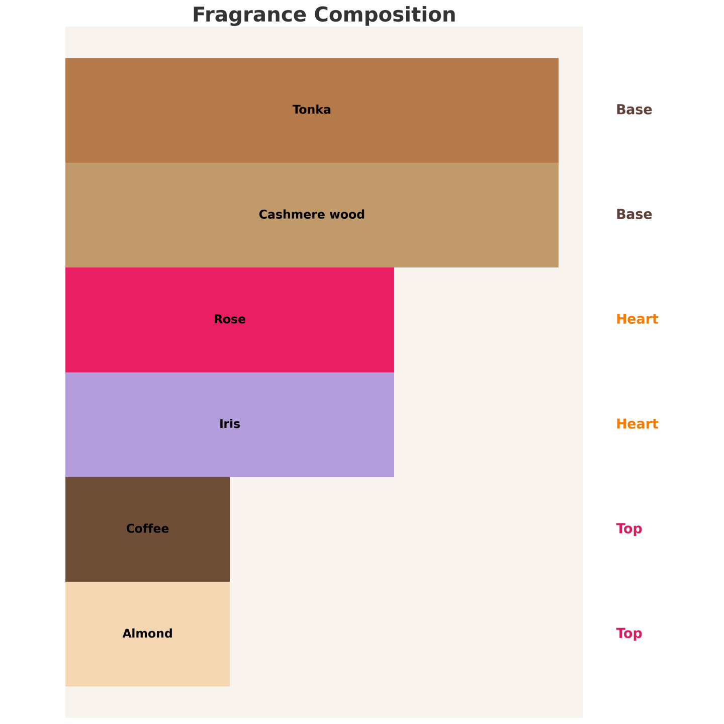 Elegancko, zmysłowo i kobieco: migdał i kawa na start, irys z różą w sercu, tonka i drzewo kaszmirowe w bazie.