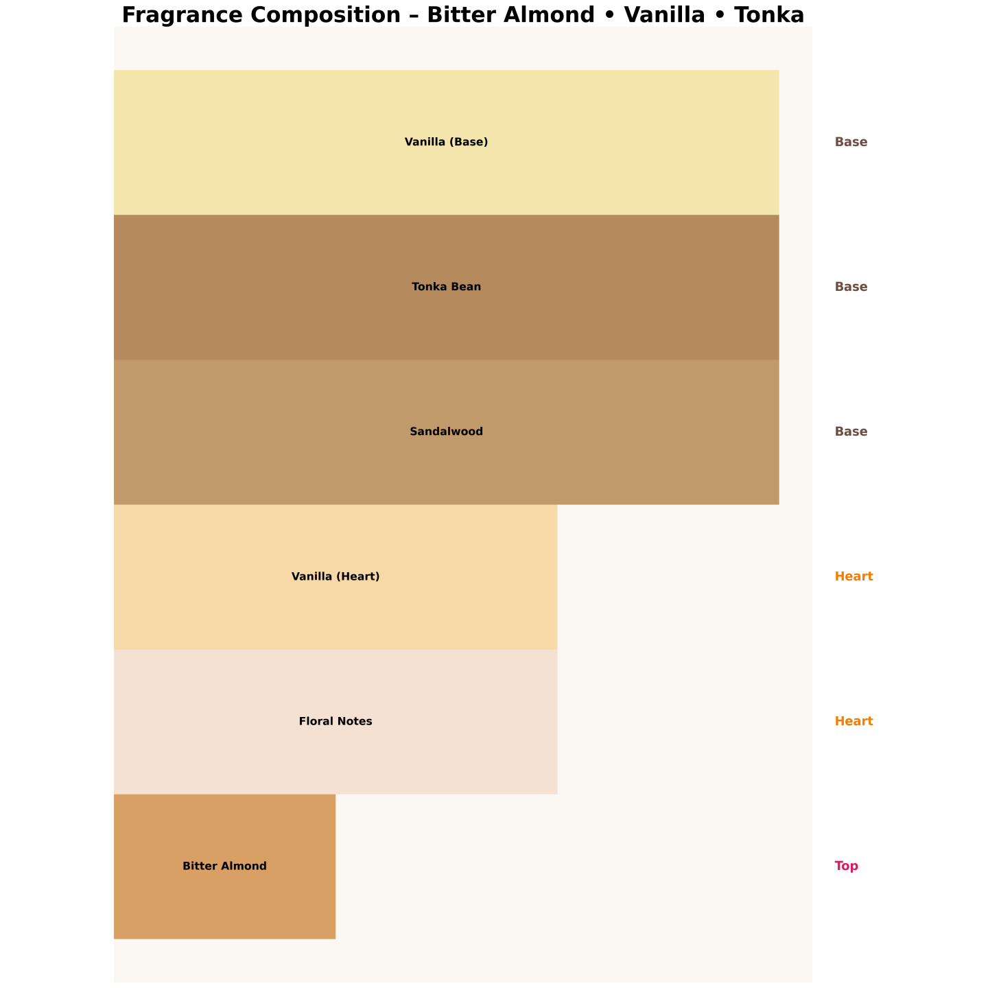 Gorzki migdał w otwarciu, kremowa wanilia w sercu i głęboka, aksamitna baza z tonki i sandałowca.